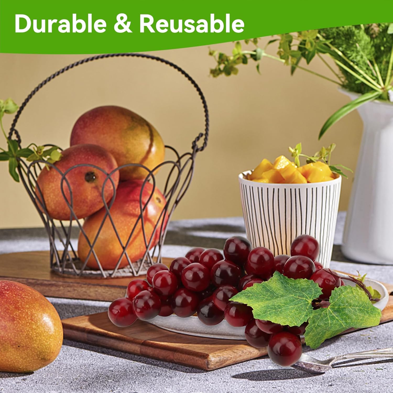 Specification: VIVID GRAPE Purple grapes are like real , Give your decor a juicy and natural look with artificial bunches of grapes!APPLICATION The artificial grapes are perfect for fruit displays, wine décor, party, ambry exhibition, home decor, market decor, teaching aid, game props, preschool enlightenment education, and so on.HIGH QUALITY The grape decor have long service life which can be used for more times and easy to clean so that you just need to wipe dust on leaves.SIZE 1 pcs, Approx. 17cm / 6.7in Item Type: Simulated Fruit Grapes Material: Foam, Plastic, PVC Length: Approx. 17cm / 6.7in Package List: 1 x Simulated Fruit Grapes RESUABLE & EASY TO CLEAN: The grape decor have long service life which can be used for more times and easy to clean so that you just need to wipe dust on leaves.WIDE APPLICATION: The artificial grapes are perfect for fruit displays, wine décor, party, ambry exhibition, home decor, market decor, teaching aid, game props, preschool enlightenment education, and so on.FAKE GRAPES: Simulated grape simulation level, in the same appearance as real grapes, it is difficult to distinguish between true and false without careful observation or measurement of weight;ARTIFICIAL FRUITS REALISTIC LOOKING: Red grapes are like real , Give your decor a juicy and natural look with artificial bunches of grapes! Artificial Red Grapes Fake Fruit