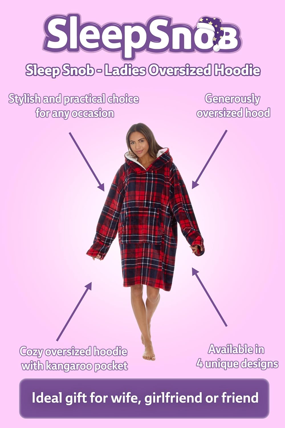 Sleep Snob Women's Oversized Blanket Hoodie Donut PrintedIntroducing our Womens Oversized Hoodie - a thermal and cozy essential with a touch of style. Crafted with comfort in mind, this hoodie features a convenient kangaroo pocket and a sherpa-lined hood. Available in a lovely light pink shade, it's designed to fit all sizes.The baby pink color and cute donut design make it an irresistible choice. Made from high-quality 100% polyester plush fleece, this hoodie is incredibly soft to the touch. Its lightweight and moisture-wicking properties provide warmth and cosiness while conserving energy. The Huggable Hoodie is designed to give you a giant hug. Whether you're on a summer camping trip, braving frosty UK mornings, enjoying movie nights with friends, or simply taking an evening nap, this hoodie is the perfect companion.Not only is it a must-have for yourself, but it also makes an ideal gift. Surprise your mom, wife, girlfriend, sister, or friend with this hoodie on Christmas, birthdays, or any special occasion. The Huggable Hoodie will wrap them in a warm and comforting embrace, even when you're far away.Extra Product DetailsCozy oversized hoodie with kangaroo pocket and sherpa-lined hood.Lovely light pink color and cute donut design.Made from soft, energy-saving, and moisture-wicking polyester fleece.Provides warmth and comfort in a lightweight package.Perfect for camping, chilly mornings, movie nights, and naps.Ideal gift for mom, wife, girlfriend, sister, or friend.Wraps you in a giant hug even when you're apart.Stylish and practical choice for any occasion.